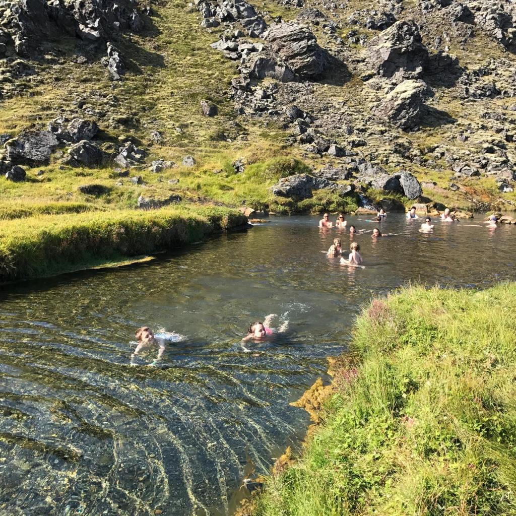 When we arrived there was a fjord to cross but I wouldn’t let Stu drive through it so we parked up and walked to the hot springs. We got changed and went in. The springs have hot water going into them from the lava and also cold water from a river so depending which way you swam determined the temperature.