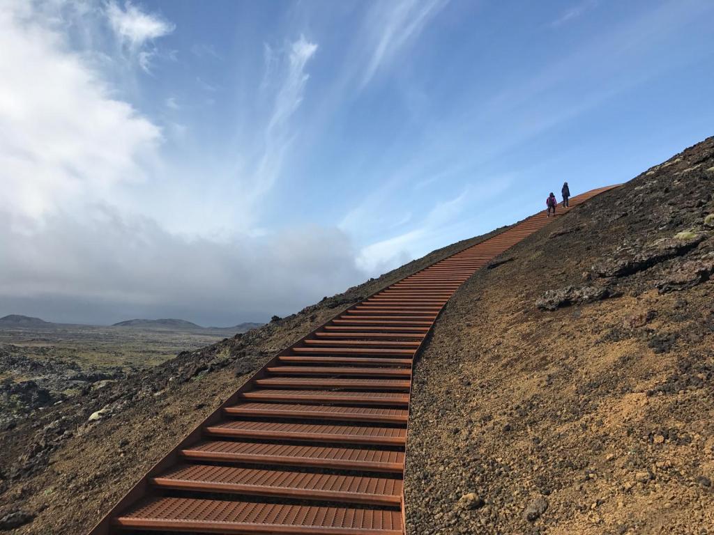 We could see that the North side of the peninsular was in sunshine – like the day before – so we headed North! We went to the Saxhóll Crater which is a volcano crater where a staircase has been built to climb to the top. It was really windy on top so we hid inside the crater for a few minutes before climbing back down!