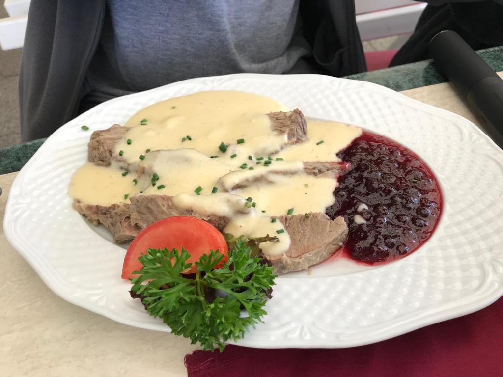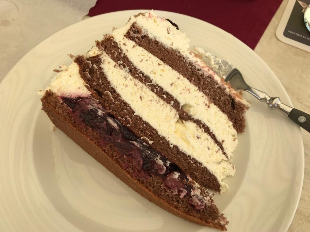 We wanted to have a traditional German lunch – so Tom ordered fish & chips and Izzy chose Spaghetti bolognaise!!! I chose schnitzel and Stu was the most adventurous by having pork with a redcurrant & cream sauce. We did have black forest gâteaux for pudding.