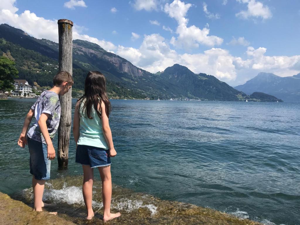 On our drive home around the lake we came across a carpark with views of the lake. We pulled in and there was a small jetty so Tom & Izzy were able to paddle in the water. We thought Lake Lucerne was stunning.
