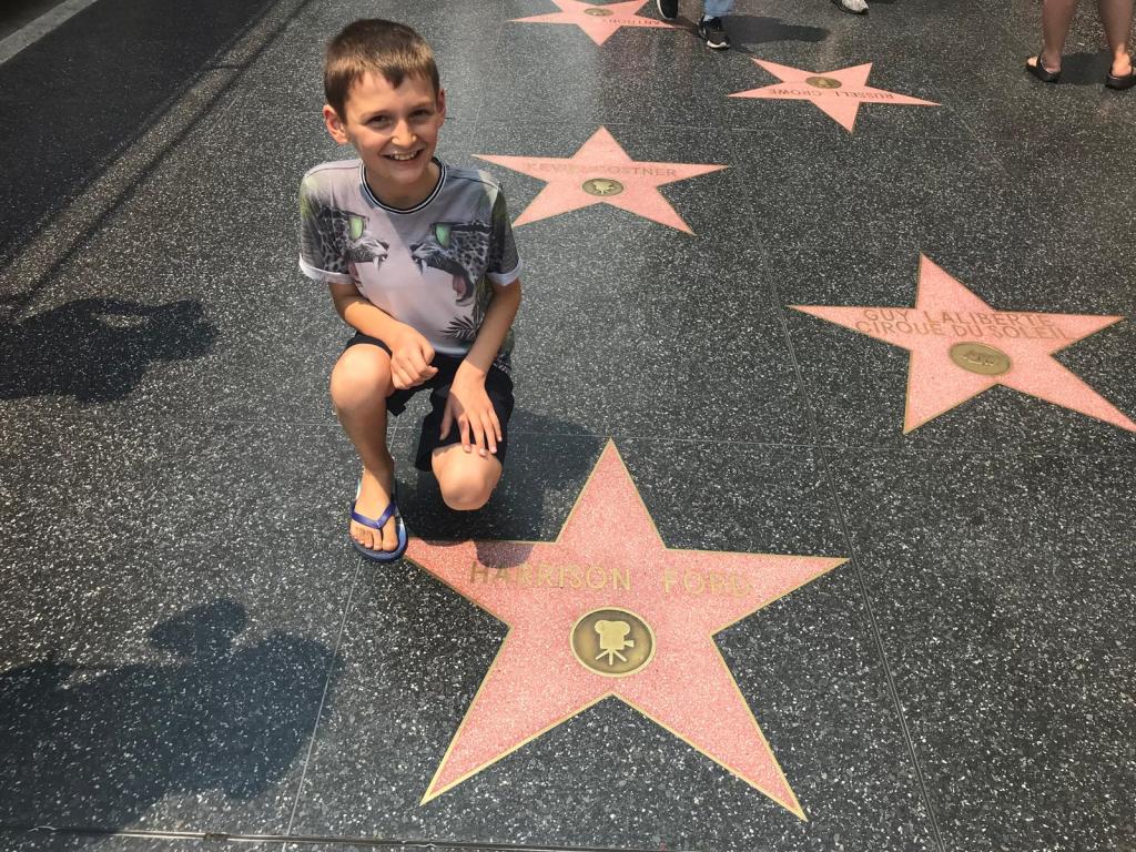 We then drove to Hollywood for lunch where we found the Hard Rock Cafe and Stu & I ordered burgers, Tom chose a hot dog and Izzy ordered chicken strips. We found the Hollywood walk of fame where Tom (who was really into Star Wars) found Harrison Ford’s star and the footprints of the characters from the movie. Izzy found the Harry Potter cast handprints.