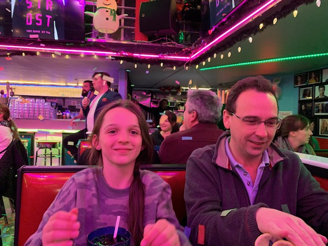 We eventually got a table downstairs in the diner. Slightly shocked when we saw the prices on the menu but it was a treat for the kids. Stu and I both had burgers (I had my first ever Mac and cheese burger) whilst Tom and Izzy both had chicken strips. For the price (about $130) we didn’t think the food was good but the entertainment was fantastic. As we left Izzy even commented that it was definitely worth the wait to get in.