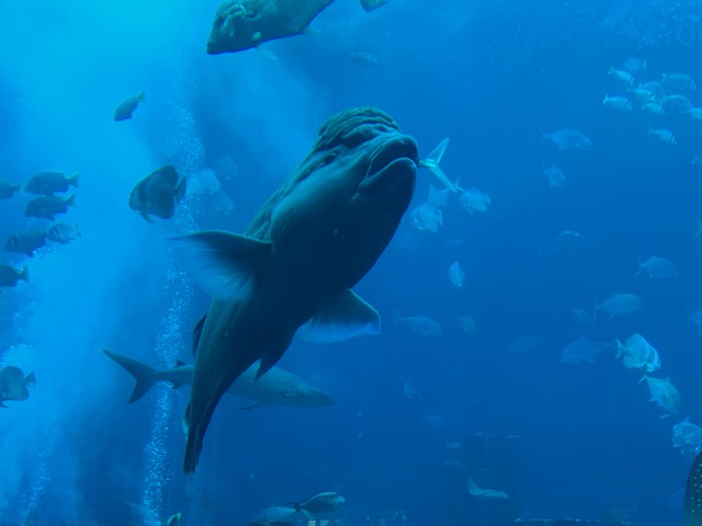 Our room wasn’t ready as we were hours too early for check in, but they took our bags and we headed down to the shops below the hotel to find some lunch. There was a gigantic fish tank on our route which was full of sharks and rays – we spent ages just watching the fish.