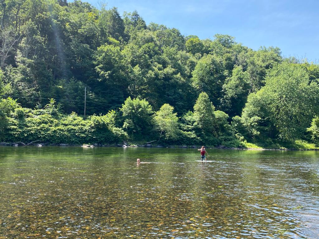 At this point it was now 2.30pm so we knew we didn’t have far left to go. We passed a couple of party groups. One group had a massive raft and were fully kitted out with food, drinks and music! We kayaked under an old bridge which only had it’s towers remaining and went through a set of river rapids – although they weren’t particularly fast. Eventually we went under the I80 and could see the Kittatinny Mountains so knew we had reached the end point.