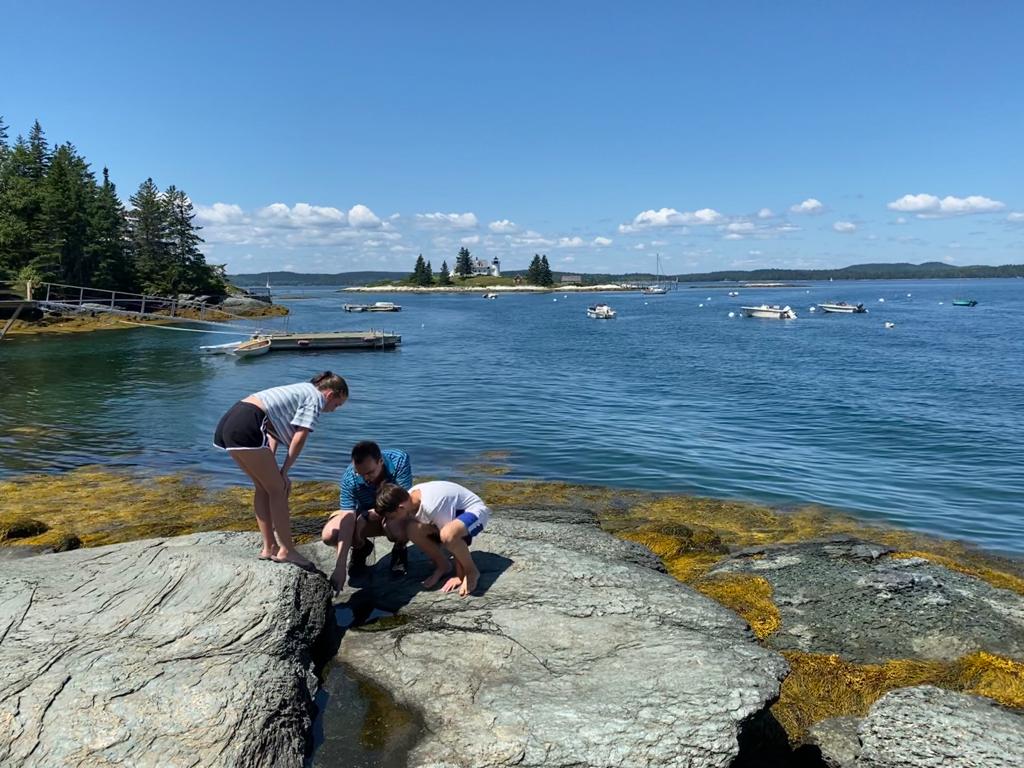 Google maps showed that there was a lighthouse a couple of miles away so we went for a look. We couldn’t get to the lighthouse as it was on a little island but we had a great view from the shore. There was also a rocky outlet with lots of rock pools so Tom and Izzy went looking for sea creatures and Stu and I found a geo-cache. We headed off Deer Isle (after a quick stop under the road bridge for ice creams and another geo-cache)