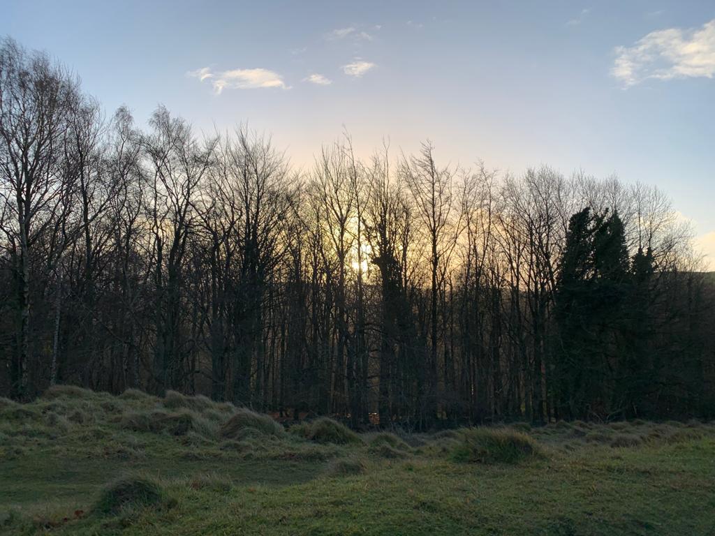 It wasn’t long before the track became really muddy, quite slippery and covered in leaves. We carried on down towards the valley where we could see the sun rising over the hills through the trees.