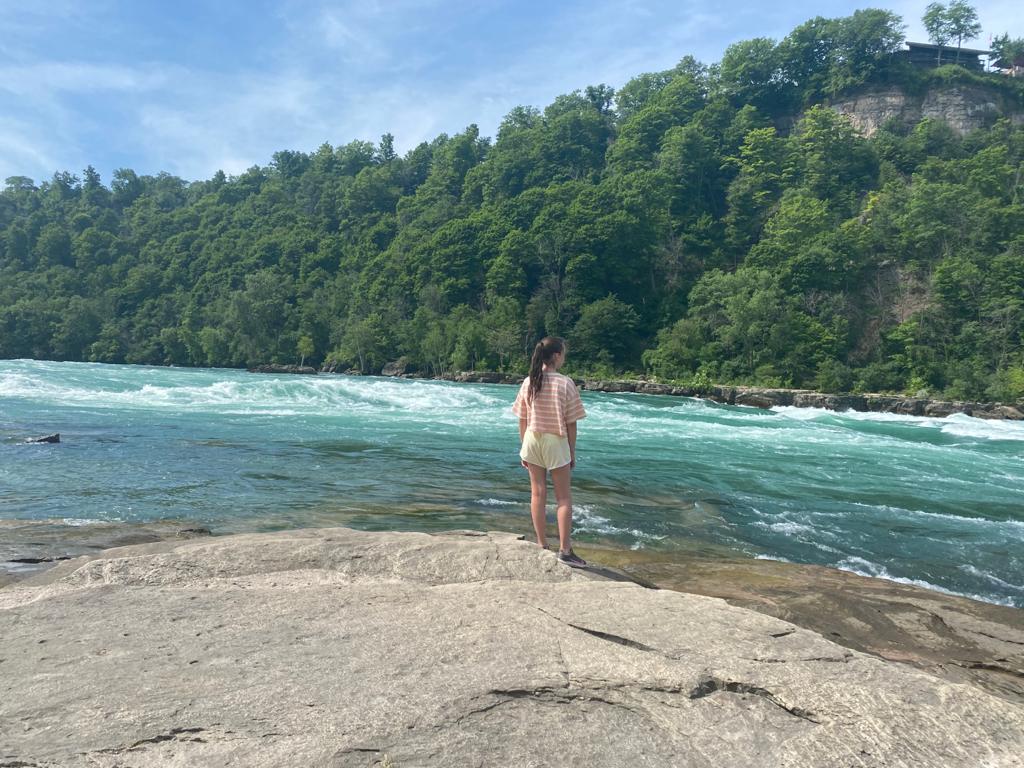 Once at the bottom there was a short walk along the river to a rocky bit of land where we could sit and admire the view. We watched a rip boat which took people on a river rapid ride. We could also see a cable car going over the rapids but as that was on the Canadian side it was out of bounds for us!