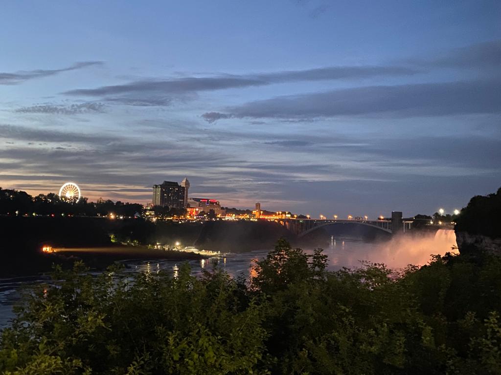 We were staying at the Hampton Inn Niagara Falls so decided to go and check in and then headed to the Hard Rock Cafe for tea where we were temperature checked before we were allowed in. Stu and I both had burgers and once we had eaten we headed back to the falls to wander up to Three Sisters Islands. We didn’t stay too long as when the sun went down, the bugs came out and we were not wearing bug spray!