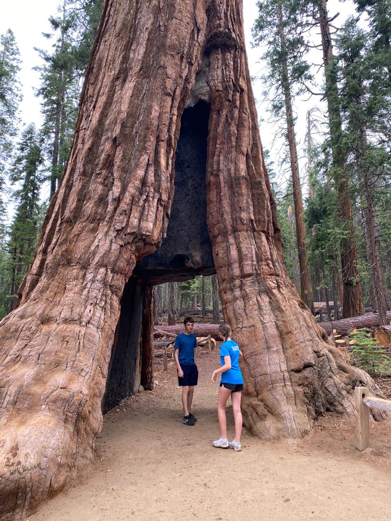 We followed the path through the grove and it took us passed some felled trees and you could see their roots. All the big sequoias had names and we saw one which had a tunnel going through it.