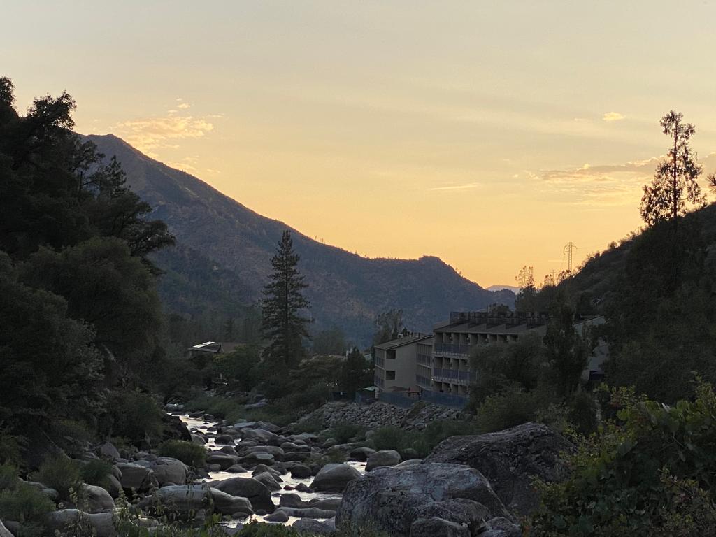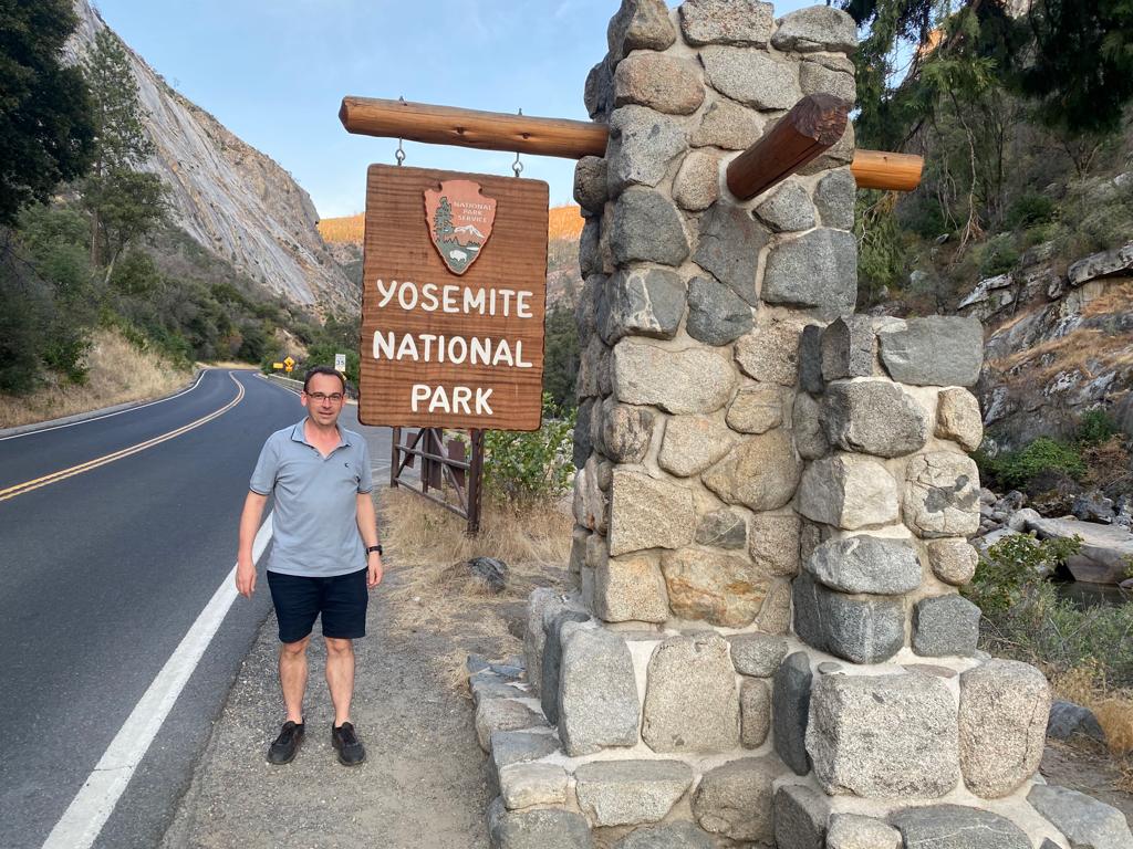 We decided to head to our motel – Yosemite View Lodge – which was right next to the Park’s south entrance. We weren’t sure what to expect but it was quite nice. A bit dated but the location was fantastic. Our room was on the ground floor and had a river view which meant we had a massive patio area to eat on. We ordered pizza for tea and then Stu & I wandered up the road to find a geo-cache and see the Yosemite NP sign.