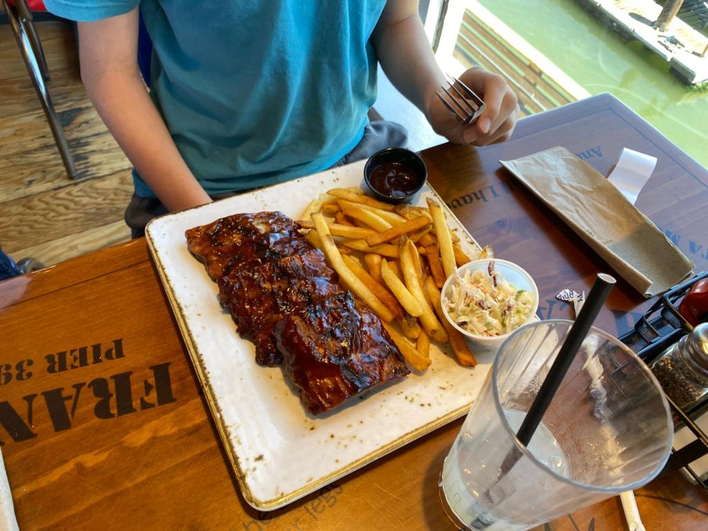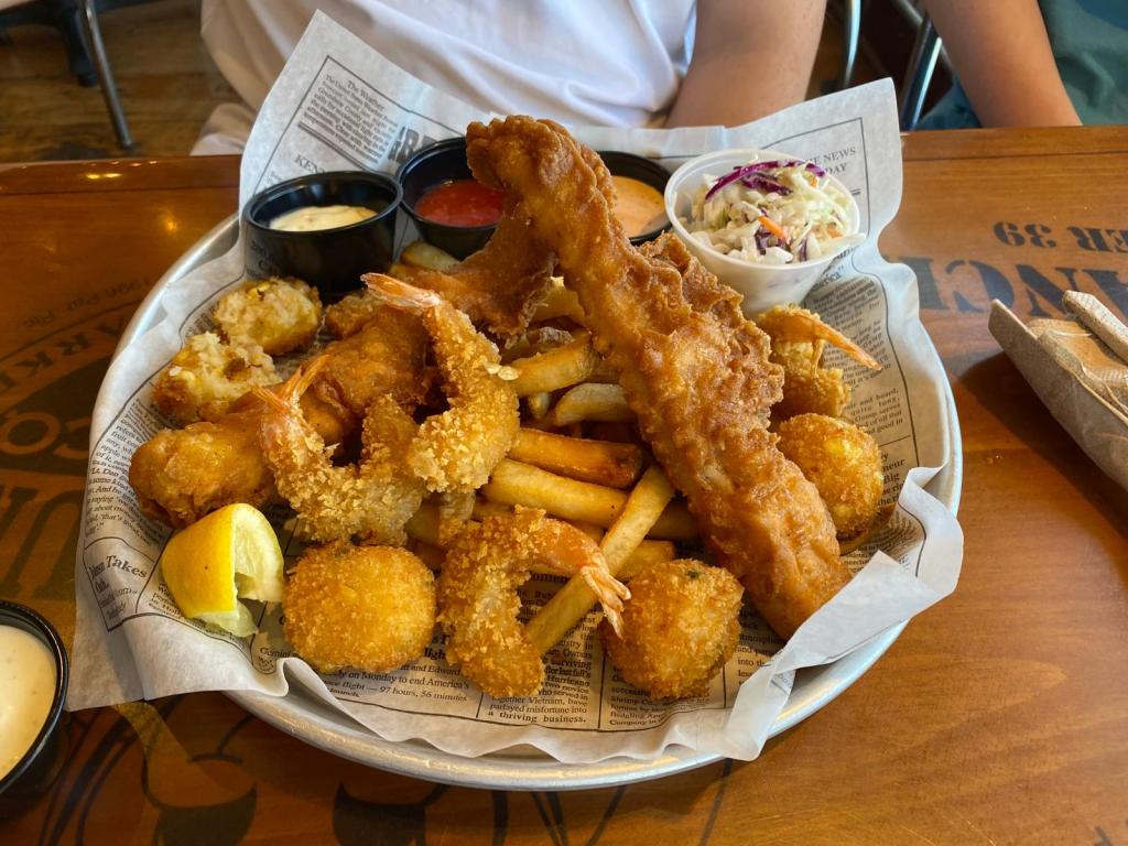 I ordered the coconut shrimp (which were amazing), Tom chose the baby back ribs, Izzy selected chicken pasta whilst Stu went for a massive seafood platter of fish & chips, shrimp, hushpuppies, coleslaw and lots of sauces!