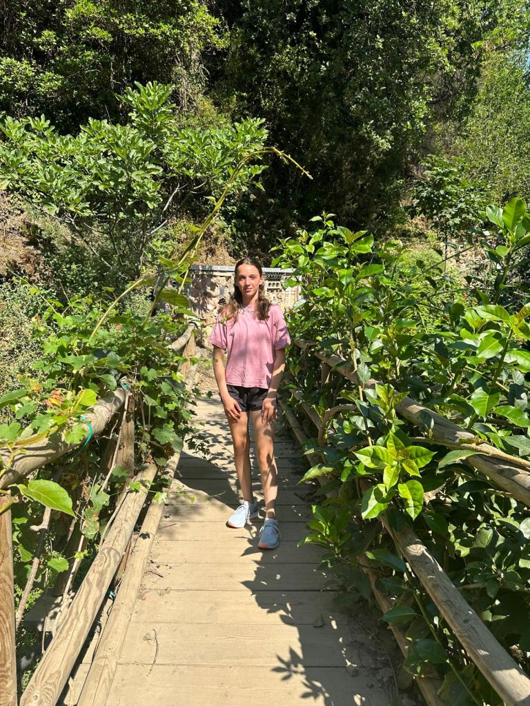 As we headed back up the hill one of the peacocks decided to walk up with us! It was really hot so we were quite grateful when we found a sprinkler system to cool off under.