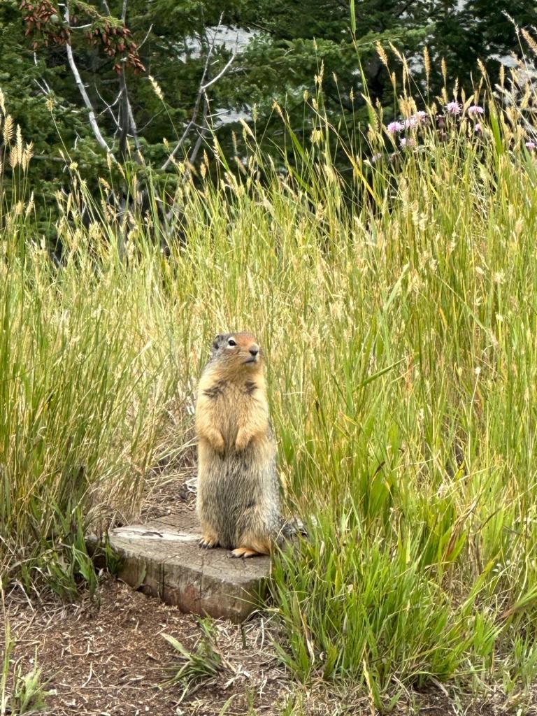 On the way to Canmore we saw a view point overlooking a lake so pulled in. There was an animal playing in the grass which we later discovered was a hoary marmot and we spent quite a long time watching him – he was not at all scared of people!