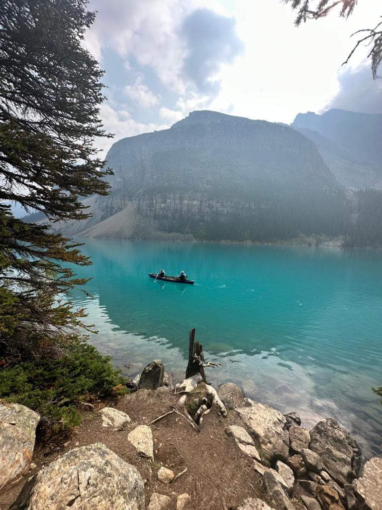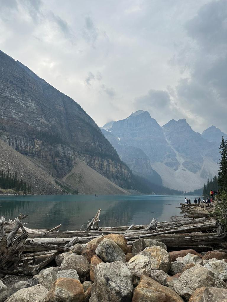 We arrived in plenty of time boarded our shuttle for the short journey and reached Moraine Lake. It was quite a misty morning but the water was so peaceful and blue!