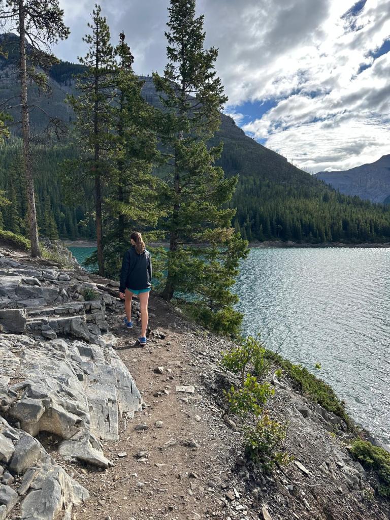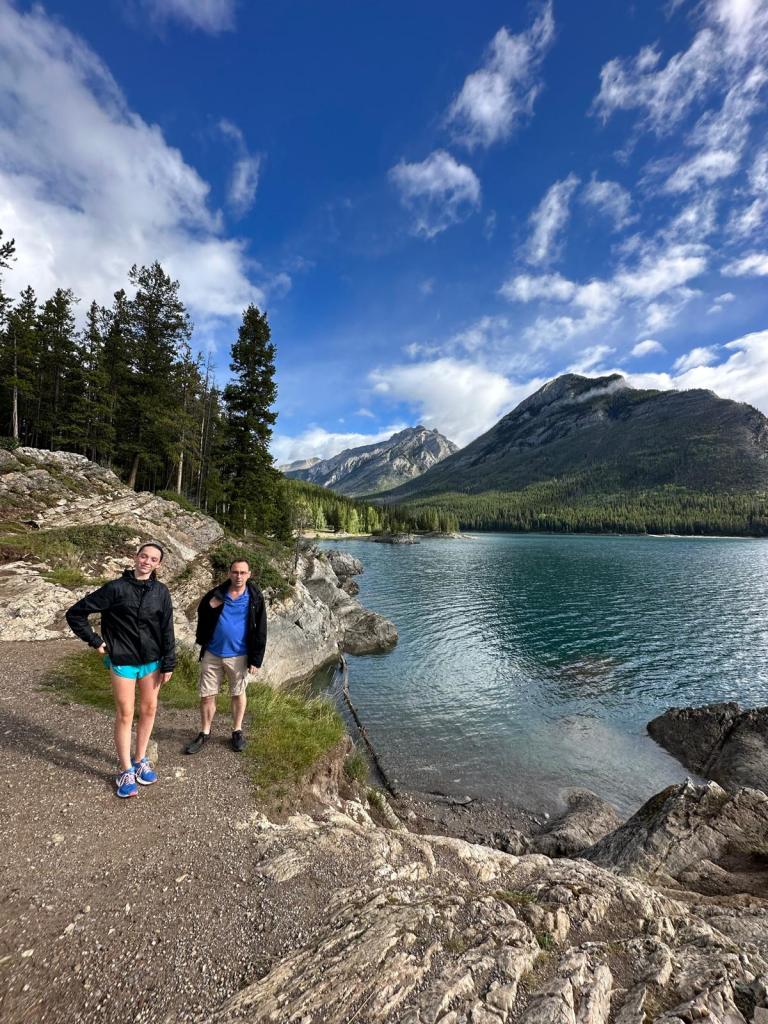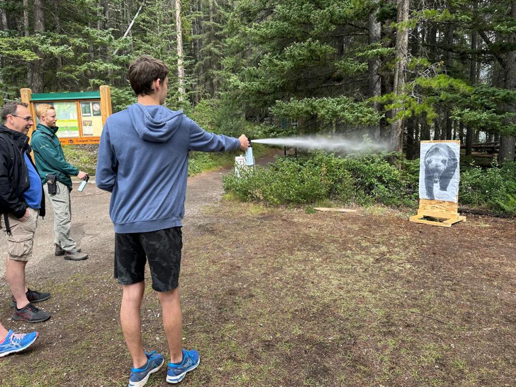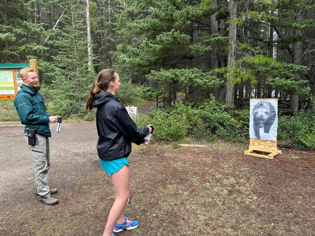 At this point we decided to turn around and head back to the Lake Minnewanka. We climbed down to the shore of the lake where we watched a chipmunk play on a log! As we returned to the carpark the Park Rangers were set up with lots of information about grizzly bears. They had some bear spray and bear posters and Tom & Izzy were both given the opportunity to learn how to use he spray cannisters. Luckily we hadn’t needed to use ours on our hike.