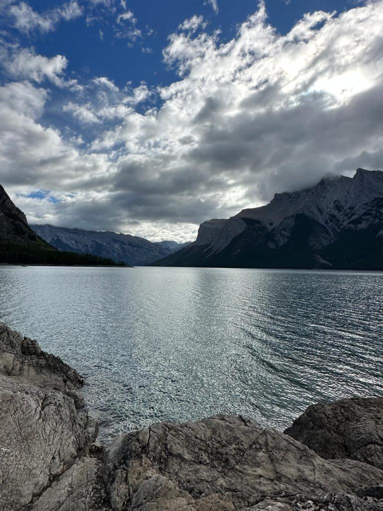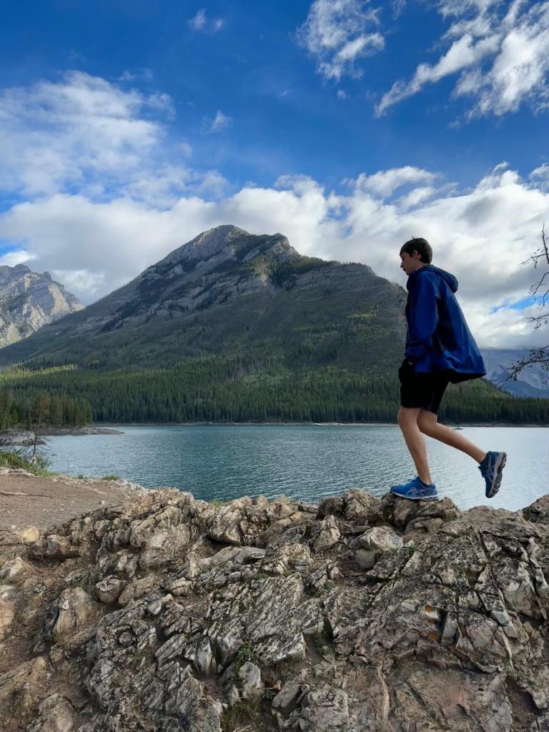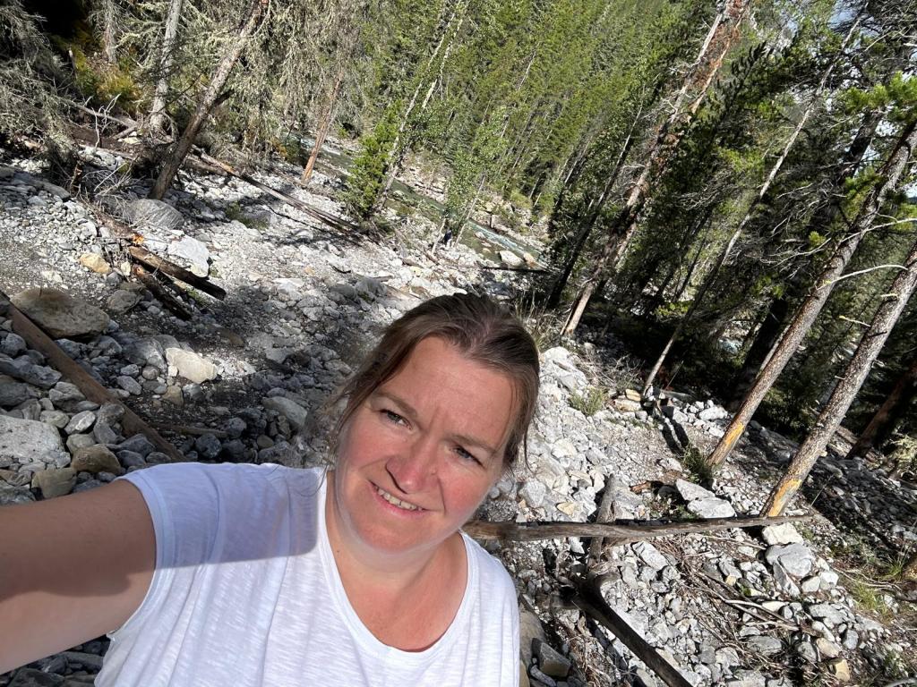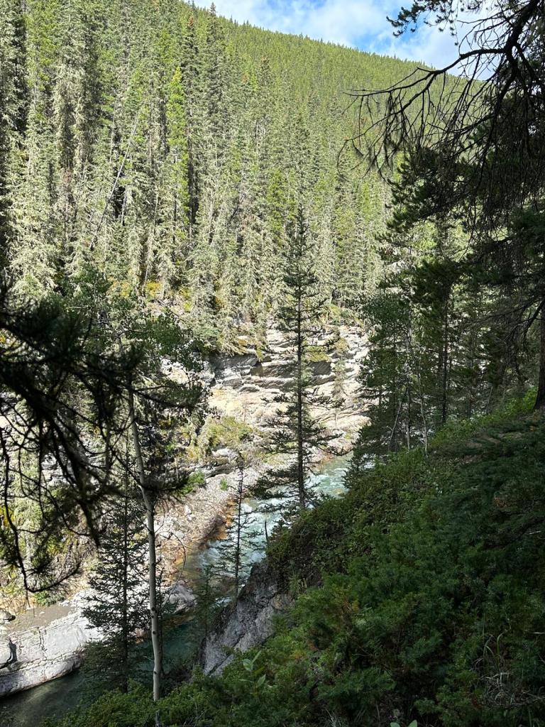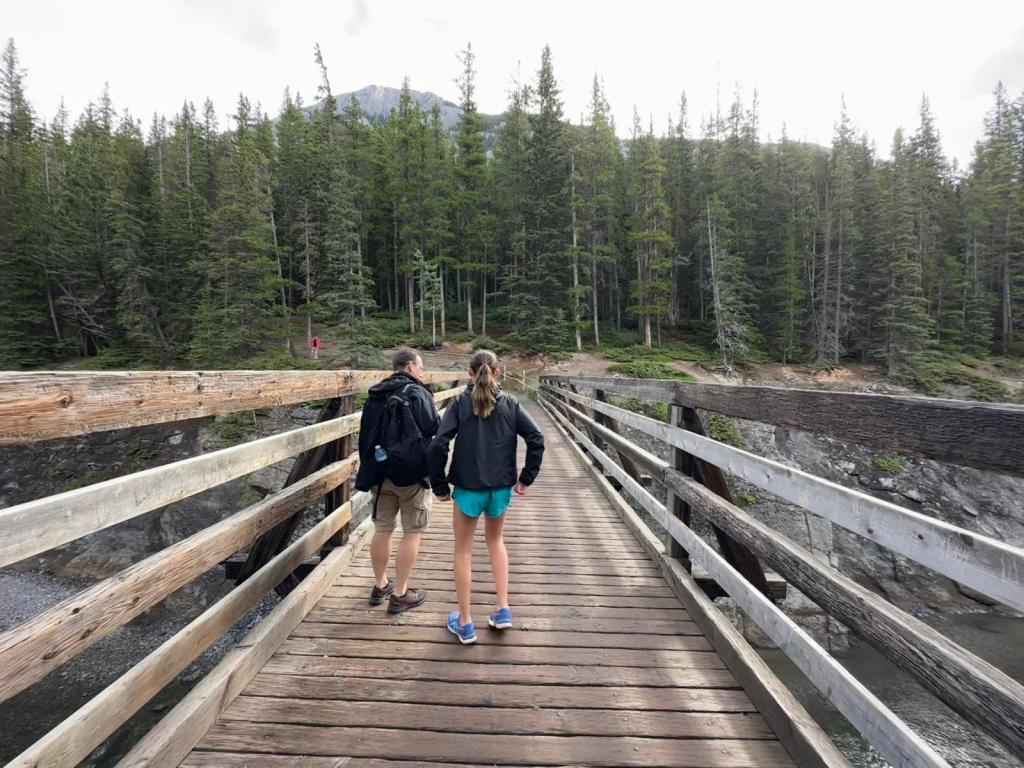 At this point we decided to turn around and head back to the Lake Minnewanka. We climbed down to the shore of the lake where we watched a chipmunk play on a log! As we returned to the carpark the Park Rangers were set up with lots of information about grizzly bears. They had some bear spray and bear posters and Tom & Izzy were both given the opportunity to learn how to use he spray cannisters. Luckily we hadn’t needed to use ours on our hike.