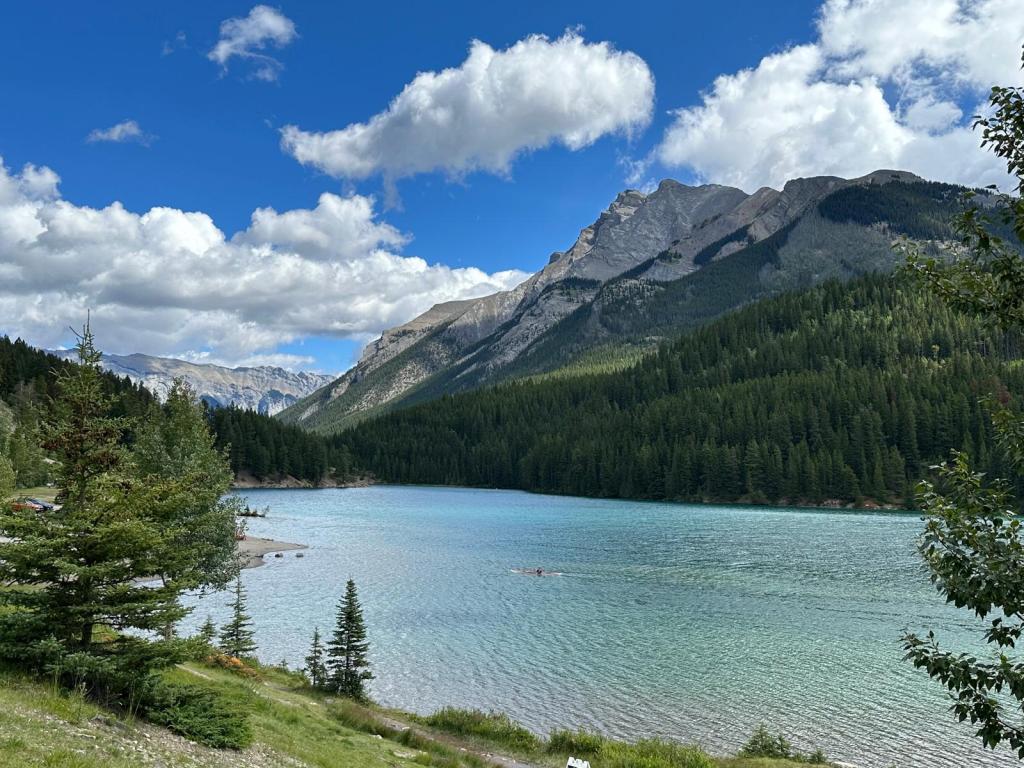 The weather was much nicer today so we planned to undertake a hike at Lake Minnewanka. Parts of the trail were considered grizzly bear territory so we were only allowed to do the hike if we were in a group of at least 4 (the rangers said grizzly’s stay well away from groups) and we carried bear spray. Stu purchased the spray on our way to the lake and had to provide ID and sign legal forms as it was kept in locked cabinets.