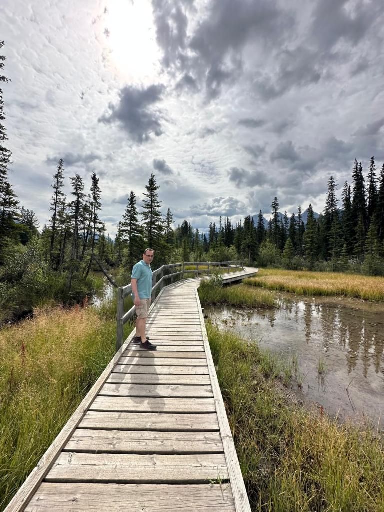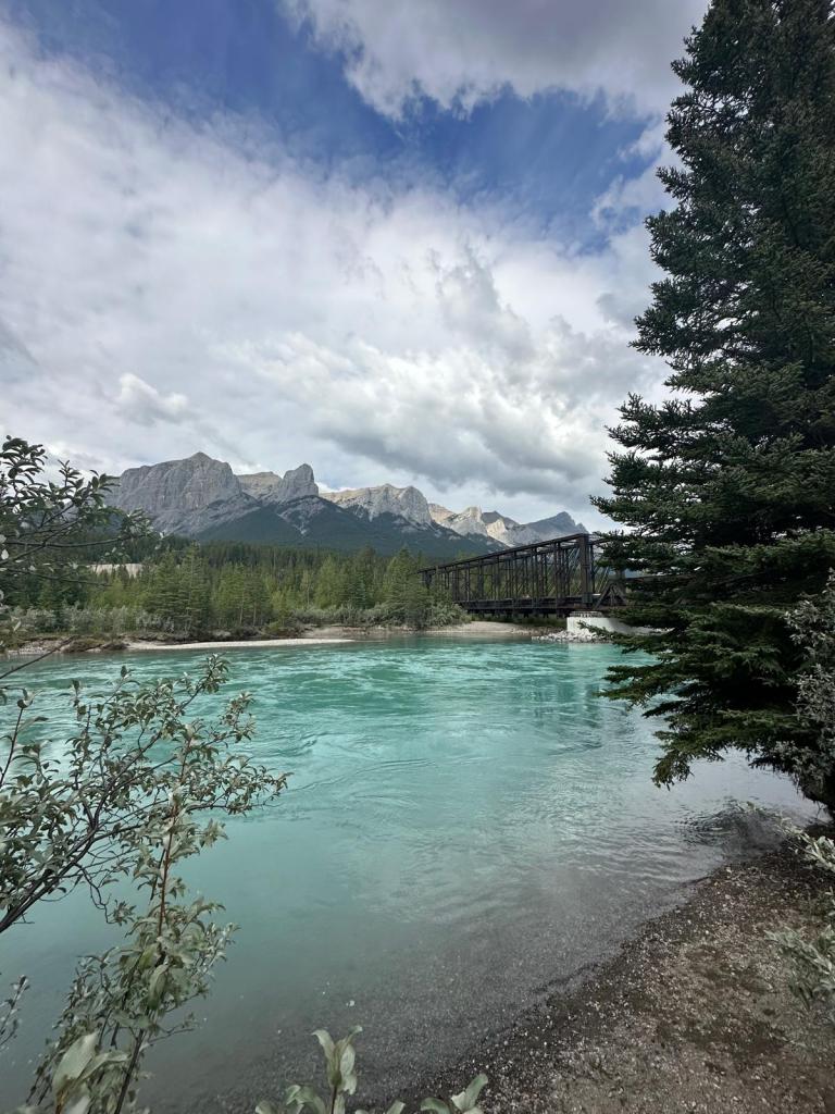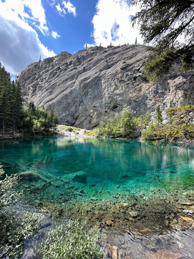 Stu & I decided we had one more hike left in us so decided to head off to the Grassi Lakes Trail which was only a ten minute drive away – we gave Tom & Izzy the day off! We parked up and headed to the lake – regretting our decision as our feet hurt. The first part of the trail was uphill through woodland and we had to cross a waterfall but we eventually reached the lake. The water was really green and we could see fish swimming around.