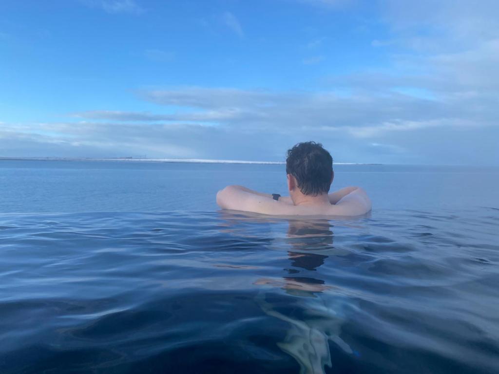 As we had upgraded our tickets we were able to do the seven step ritual. This firstly involved enjoying the warm lagoon and then we could do a cold plunge pool. Stu, Tom and Izzy took part in that – I put my feet in and it was far too cold! We then entered the sauna which had massive glass windows overlooking the sea. We entered a cold mist room and were given a salt scrub to use. It was all really good fun.