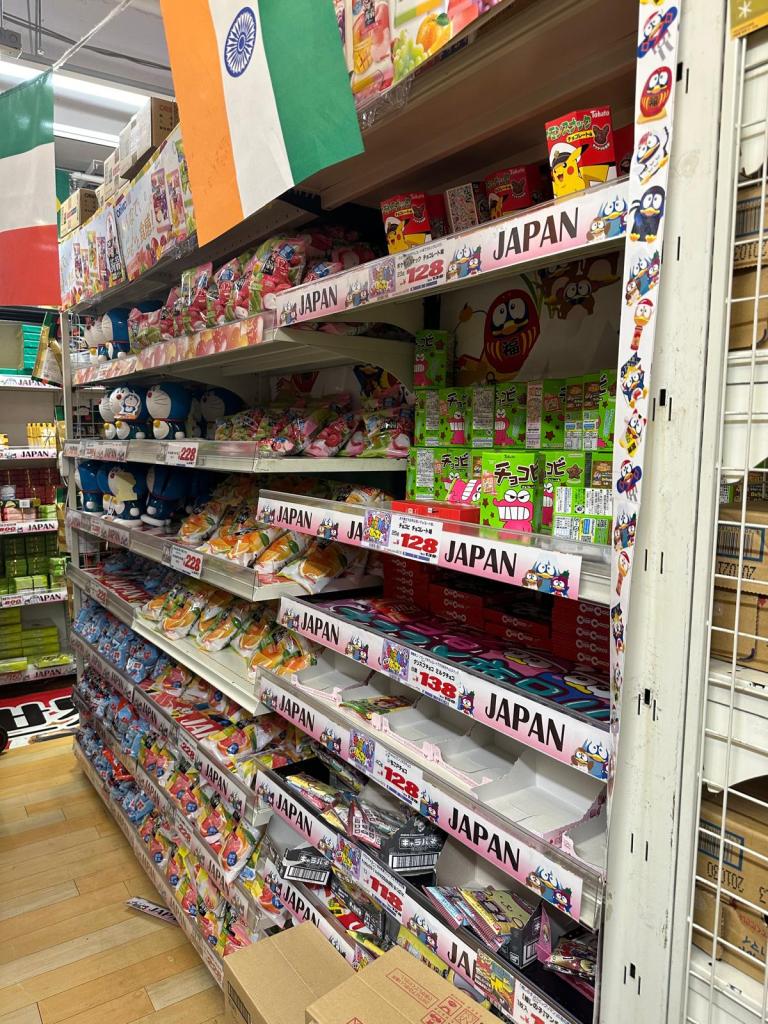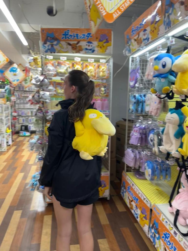 We loved Shibuya Crossing – very bustling and the buildings were all covered with tv screens playing constant adverts. As it was wet rather than walk around outside we decided to visit some of the shops. We found our first Don Quijote – and it was a mega store! Don Quijote is a discount store which we had seen on tik tok and it was full of sweets, beauty products, stationary – everything you could image. It also has a very catchy song which is played constantly throughout the store! Even Tom who hates shopping enjoyed mooching around the shop and we bought lots of facemasks, mobile phone stickers and pens.