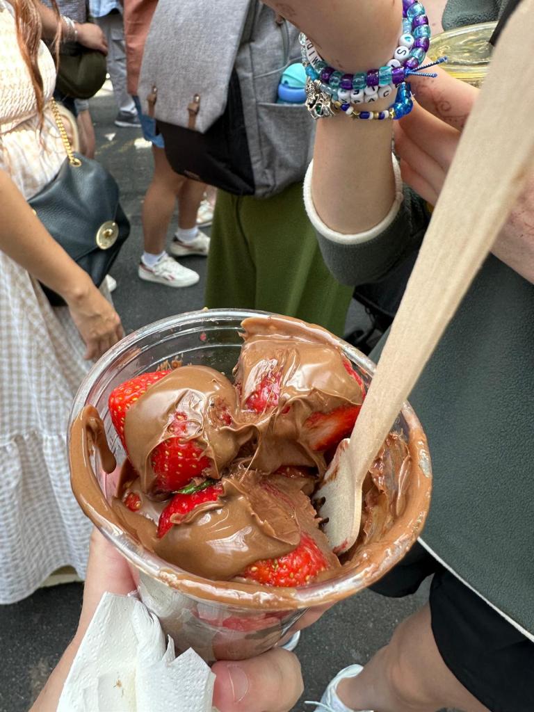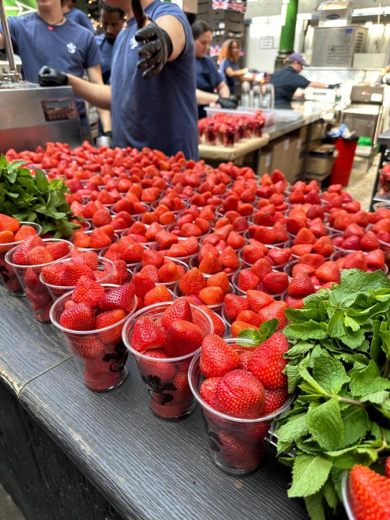 We left our bags at the hotel and decided to visit Borough Market to try some of the food as we had seen lots of the food stands on tik tok. The market was absolutely packed – there was no where really to stand or sit so we settled for some chocolate covered strawberries. They were really good but also very expensive! We then went for a wander and had lunch in Burger and Beyond which was really peaceful and quiet.